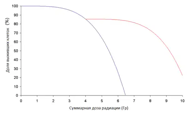 На приведённом ниже графике дуга доза/выживаемость для гипотетической группы клеток нарисована для случаев, когда клетки имели или не имели времени для восстановления. Кроме времени на восстановление от радиации клетки этих двух групп находились в одинаковых условиях.
