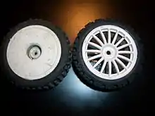 Шину модели не накачивают воздухом как на настоящем автомобиле, вместо этого между шиной и диском делается вставка из пенного наполнителя, её жёсткость заметно влияет на поведение модели. Покрышки для дрифта не имеют полости внутри, а являются монолитными. Эта дисциплина характеризуется очень жесткими покрышками, зачастую для дрифта используют ПВХ трубы, обычно используемые в водопроводных системах. Колёсные диски в основном делаются из пластика, металлические из-за большой массы используют в дисциплинах "Трофи" для понижения центра тяжести. Часто используют сплошные диски без спиц (dish type), уменьшающие аэродинамические завихрения.
