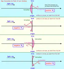 Радиус кривизны имеет особое значение и регулируется соглашением о знаке при проектировании оптических систем. Сферическая линза или зеркальная поверхность имеет центр кривизны, расположенный либо вдоль локальной оптической оси системы, либо децентрализован относительно неё. Вершина поверхности линзы расположена на локальной оптической оси. Расстояние от вершины до центра кривизны — это радиус кривизны поверхности[1][2].