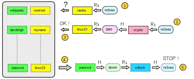 - Вычисляем цепочку длины 2: R3(H(R2(«re3xes»)))="linux23".