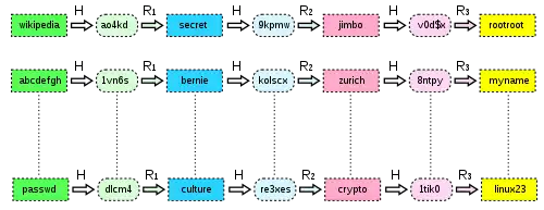 Цепочки хешей — метод для уменьшения этого требования к объёму памяти. Главная идея — определение функции редукции R, которая сопоставляет значениям хеша значения из P. Заметим, что R не является обращением хеш-функции. Начиная с исходного пароля и попеременно применяя к каждому полученному значению H и R, мы получим цепочку перемежающихся паролей и хешей. Например, для набора паролей длиной в 6 символов и хеш-функции, выдающей 32-битные значения, цепочка может выглядеть так: