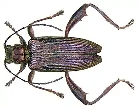 Имаго длиной 9—13 мм[5]. Верхняя сторона тела фиолетовая, синяя, зелёная, бронзовая или чёрная. Усики и ноги контрастные чёрные с рыжим. Данный вид характеризуется следующими признаками[6]: