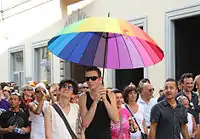 Радужный флаг (также известный как Прайд-флаг (англ. Pride flag)[1][2], Флаг свободы (англ. Freedom flag)[3]) — интернациональный символ сообщества лесбиянок, геев, бисексуалов и трансгендерных людей (сокр. ЛГБТ-сообщество), а также движения в поддержку прав человека в их отношении[4]. Традиционно флаг состоит из шести продольных полос, цвета которых (за исключением голубого цвета) идут в соответствии с природным порядком радуги сверху вниз: красный, оранжевый, жёлтый, зелёный, синий и фиолетовый[5]. Флаг используется в шествиях гей-прайдов и других общественных акциях, вывешивается в гей-кварталах, на зданиях ЛГБТ-организаций, «Gay-friendly» заведений и так далее.