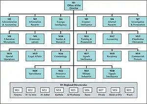 Мухабарат состоял из нескольких бюро, которые курировали отдельные управления. В следующем списке представлены управления, разделенные по бюро, и краткое описание управления[4]: