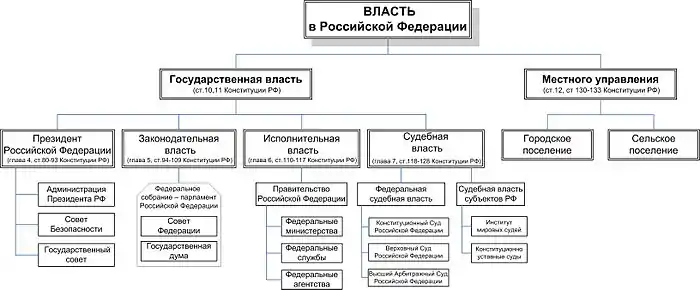 Согласно статье 11 Конституции РФ[8], государственную власть осуществляют президент Российской Федерации, Федеральное собрание (Совет Федерации и Государственная дума), Правительство Российской Федерации, суды Российской Федерации.