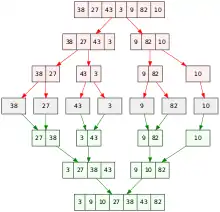 Парадигма «Разделяй и властвуй» часто используется для поиска оптимального решения той или иной проблемы. Его основная идея состоит в том, чтобы разложить данную задачу на две или более сходных, но более простых подзадач, решить их поочередно и скомпоновать их решения. Например, чтобы отсортировать заданный список из n натуральных чисел, необходимо разбить его на два списка примерно из n /2 чисел каждый, отсортировать каждый из них по очереди и скомпоновать оба результата соответствующим образом, чтобы получить отсортированную версию данного списка (см. рисунок). Этот подход известен как алгоритм сортировки слиянием.