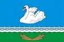 Прямоугольное полотнище с соотношением ширины и длины 2:3, состоящее из двух горизонтальных полос синего и зеленого цветов, составляющих соответственно 3/4 и 1/4 ширины флага. В нижней части синей полосы — три белые волнистые полосы шириной: две верхние — 1/40, а нижняя — 1/20 ширины флага. В центре синей полосы — белый, с красным клювом и черными надглазья, плывущий к древку лебедь высотой 2/5 ширины флага, в центре зеленой полосы — цветок подсолнечника, из-за которого выходят по три веерообразно в каждую стороны шесть головок пшеничных колосьев — все желтого цвета.[36]