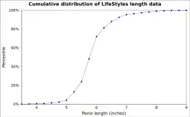 В исследовании, проведённом компанией «LifeStyles Condoms», средняя длина полового члена установлена 14,9 см (5,9 дюйма) со стандартным отклонением 2,1 см (0,8 дюйма) (при измерении, выполненном штатными сотрудниками)[30]. Цель этого исследования состояла в том, чтобы обеспечить наличие в продаже необходимых размеров презервативов. Группа из 401 студента колледжей выразила желание подвергнуться измерению во время весенних каникул 2001 года в городе Канкун (Мексика). У 300 из них эрекцию вызвали клинически, без помощи медикаментов. При 300 эффективных измерениях это исследование превысило в два раза любое предыдущее исследование, которое включало измерение размера полового члена медицинским персоналом (но эта выборка более представляла студентов колледжа, посетивших г. Канкун и желающих измерения своих половых членов, а не любую группу американских мужчин)[31].