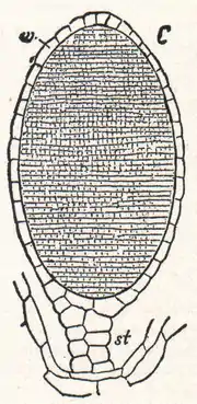 У высших растений спорангии многоклеточные, их клетки дифференцированы. Фертильные клетки составляют археспорий — спорогенную ткань, наружные стерильные клетки составляют защитную стенку. Из наружных клеток археспория формируется выстилающий слой — тапетум, который, расплываясь, образует периплазмодий. Содержащиеся в нём питательные вещества расходуются на образование спор[11].
