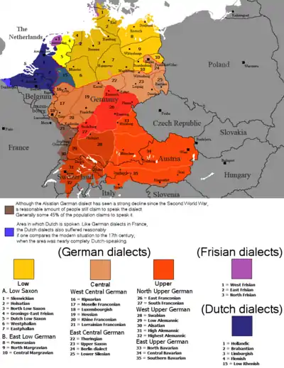 Всё немецкоязычное пространство входит в западногерманский диалектный континуум, куда также входит и нидерландский язык. С последним немецкий язык имеет тесные исторические связи[11]. На севере Германии, выше изоглоссы maken/machen, распространены нижненемецкие диалекты, которые включают нижнефранкские, нижнесаксонские и восточнонижненемецкие диалектные группы. Первые две встречаются как в Нидерландах, так и в Германии. Южнее линии maken/machen лежат верхненемецкие диалекты, претерпевшие второй перебой согласных. В их число входят южнонемецкие диалекты, включающие швабско-алеманнскую, баварскую и верхнефранкскую диалектные группы, а также средненемецкие диалекты, в числе которых гессенские, среднефранкские, тюрингские, силезские, лужицкие, берлинско-бранденбургские диалекты.
