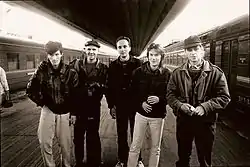 ![]() Группа «Разные люди» (Александр Чернецкий, Павел Михайленко, Алексей Сечкин, Сергей «Чиж» Чиграков, Олег Клименко) на вокзале в Санкт-Петербурге 19 сентября 1993 года. Фото Валерия Потапова. | |