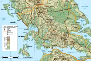 - остров Кефалиния — Здесь произошли самые трагические события (Бойня дивизии Акви), когда после 10-дневного боя, сдавшиеся в плен итальянцы были перебиты. Общее число погибших итальянцев достигло 10 тыс.