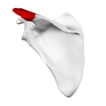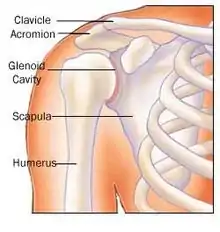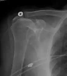 Обычно первый расположен ниже второго, и поэтому переворот указывает на разрыв вращательной манжеты.[44] Длительный контакт между высоко расположенной головкой плечевой кости и акромионом над ней может привести к обнаружению на рентгеновских снимках износа головки плечевой кости и акромиона или вторичного дегенеративного артрита плечевого сустава, называемого артропатия манжеты.[43] Случайные рентгенологические находки костных шпор в соседнем акромиально-ключичном суставе могут показать костную шпору, растущую от внешнего края ключицы вниз к вращающей манжете. На нижней стороне акромиона также можно увидеть шпоры, которые, как когда-то считали, вызывают прямое истирание вращающей манжеты из-за контактного трения, концепция, которая в настоящее время считается спорной.