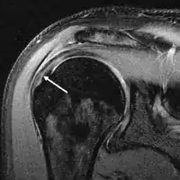 Магнитно-резонансная томография (МРТ) и ультразвук[39] сравнимы по эффективности и полезны в диагностике, хотя оба имеют ложноположительный уровень 15–20%.[40] МРТ может надёжно обнаружить большинство разрывов на всю толщину, хотя очень маленькие точечные разрывы можно не заметить. В таких ситуациях МРТ в сочетании с инъекцией контрастного вещества, МР-артрограмма может помочь подтвердить диагноз. Следует понимать, что обычная МРТ не может полностью исключить небольшой разрыв (ложноотрицательный результат), в то время как разрывы частичной толщины не могут быть обнаружены с такой надежностью.[41] Хотя МРТ чувствительна к выявлению дегенерации сухожилия (тендинопатии), она не может надежно отличить дегенеративное сухожилие от частично разорванного сухожилия. Опять же, магнитно-резонансная артрография может улучшить дифференциацию.[41] Её общая чувствительность - 91% (т.е. 9% ложноотрицательных результатов), таким образом магнитно-резонансная артрография является надёжной при обнаружении разрывов частичной толщины вращающей манжеты манжеты.[41] Однако его обычное использование не рекомендуется, поскольку оно связано с введением в сустав иглы с потенциальным риском заражения. Следовательно, тест предназначен для случаев, когда диагноз остается неясным.