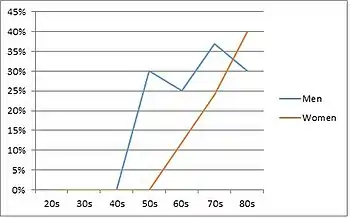 В исследованиях разрывов вращательной манжеты с аутопсиями частота частичных разрывов составила 28%, а полного разрыва - 30%. Часто разрывы возникали с обеих сторон и чаще возникали у женщин и людей бОльших возрастов.[79] Другие исследования на трупах показали, что разрывы со стороны сухожилий встречаются чаще (7,2%), чем со стороны сумок (2,4%) или со стороны суставов (3,6%).[80] Однако клинически установлено, что разрывы со стороны суставов происходили в 2–3 раза чаще, чем со стороны сумок, и среди популяции молодых спортсменов разрывы со стороны суставов составляли 91% всех разрывов частичной толщины.[80] Разрывы ротаторной манжеты чаще встречаются у мужчин в возрасте от 50 до 60 лет, хотя в возрасте от 70 до 80 разница между полами минимальна.[77][81]