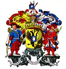 На месте щитодержателей стоят: с одной стороны вооружённый скиф с открытой головой, в левой руке держащий щит, у которого верхнее одеяние голубого цвета, а нижнее — красного, на поясе висят серебряная сабля, в руке золотой скифский лук, за спиной колчан. С другой стороны таким же образом вооружённый поляк с открытой головой, держащий правой рукой щит, у которого верхнее платье красного, а нижнее голубого цвета. В другой руке он держит золотое метательное копьё.