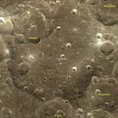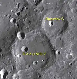 ![]() Снимок зонда Lunar Rec. Кратер Разумов в центре снимка, в нижней части – кратер Петропавловский, слева вверху кратер Ландау. | |
