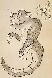 В Китае «громового зверя» описывали животным с обезьяньей головой, имеющим зеркальные глаза, малиновые губы и на каждой лапе по два острых когтя.[1] В японской книге «Синрайки» (Записки о Громе) приводилось свидетельство, что в июле 1766 года «громовой зверь» упал на гору Ояма в провинции Сагами, где и был пойман местным крестьянином, который демонстрировал его за плату на мосту Рёгоку в Эдо. По описанию, это незнакомое японцам животное выглядело как ласка, имело чёрную шерсть, а размером едва превышало домашнюю кошку, лапки были пятипалыми. При хорошей погоде зверёк был смирным, а в грозу становился диким и неуправляемым.[1]