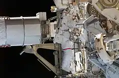 - Второй полёт — STS-104[6], шаттл «Атлантис». C 12 по 25 июля 2001 года в качестве «специалиста полёта». Основной задачей STS-104 была доставка на станцию (10-й полёт шаттла к МКС[7]) шлюзового модуля «Квест» и различные грузы (расходуемые материалы, запас воды, научное оборудование). Во время полёта STS-104 было осуществлено три выхода в открытый космос. Все три совершены астронавтами Майклом Гернхардтом и Джеймсом Райли[8]. 15 июля c 3:10 до 9:09 (UTC), длительность 5 часов 59 минут. Перенос (с помощью манипулятора Канадарм2) и установка шлюзовой камеры «Квест» на стыковочный узел модуля «Юнити». 18 июля c 3:04 (старт планировался на 02:09, но из-за сбоя компьютерной системы на американском сегменте (отказ жёсткого диска основного управляющего компьютера C&C № 3) в 22:45 17 июля, был начат позднее до 9:33 (UTC), длительность 6 часов 29 минут. Установка на шлюзовую камеру трёх газовых баллонов. 21 июля c 4:35 до 8:37 (UTC), длительность 4 часа 2 минуты. Установка последнего (четвёртого) баллона, проверка. Продолжительность полёта составила 12 суток 18 часов 35 минут[9].