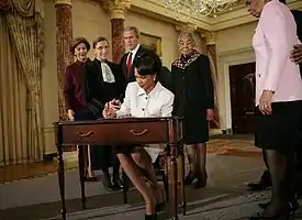 16 ноября 2004 года кандидатура Кондолизы Райс была выдвинута на пост Государственного секретаря США, вместо Колина Пауэлла, об отставке которого было объявлено днём ранее. На освободившийся пост советника по национальной безопасности был назначен Стивен Хэдли. 7 января 2005 года на пост заместителя государственного секретаря была предложена кандидатура торгового представителя США Роберта Зойлика. 19 января 2005 года комитет сената США по международным отношениям проголосовал 16 голосами против 2 за вынесение кандидатуры Райс на утверждение сенатом. Против Райс проголосовали представители Демократической партии Джон Керри и Барбара Боксер. Во время обсуждения в комитете сената Барбара Боксер подняла на обсуждении вопрос о личной жизни Райс, который некоторые наблюдатели посчитали неуместным в подобной ситуации. 26 января 2005 года на заседании сената Кондолиза Райс 85 голосами против 13 была утверждена на посту государственного секретаря. Такое количество голосов поданных против утверждения госсекретаря было самым большим с 1825 года. Против голосовали независимые сенаторы и сенаторы от Демократической партии, которые, по мнению Барбары Боксер, хотели чтобы «доктор Райс и администрация Джорджа Буша несли ответственность за провал операции в Ираке и войну с терроризмом», они аргументировали своё решение тем, что Райс была безответственна, приравнивая режим Хусейна к исламскому терроризму, и в целом не поддерживали принимаемые ей решения.