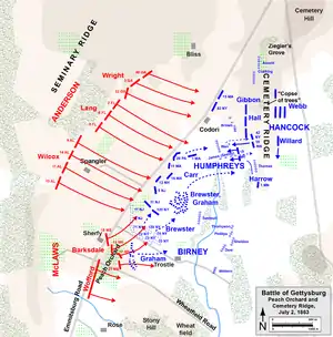 Бригада атаковала два федеральных полка на Эммитсбергской дороге, обратила их в бегство и захватила орудие батареи Брауна, а затем ещё два орудия той же батареи в момент их отхода. Затем они снова атаковали противника (бригаду Нормана Холла), которая стояла за каменной стеной выше по склону. Холл оказался в сложном положении: два его полка (42-й Нью-Йоркский и 19-й Массачусетский) были переброшены на помощь дивизии Хэмфриса, поэтому у него осталось всего три полка с открытым левым флангом[3].