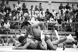 ![]() Валентин Райчев (внизу) в олимпийской финальной схватке с Жамцыном Даваажавом. 25 июля 1980 года, Москва | |