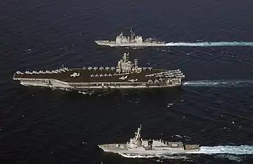 ![]() Крейсер типа «Тикондерога» USS Port Royal (CG-73) и авианосцы USS Nimitz (CVN-68) и USS Independence (CV-62) у берегов Йокосуки (Япония) 25 сентября 1997 года. |
