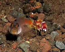 Некоторые виды раков-щелкунов делят норы с рыбами-бычками, таким образом состоя с ними в симбиотических отношениях. Роет такую нору креветка, бычок же обеспечивает безопасность, наблюдая за обстановкой. Когда оба они находятся вне норы, креветка поддерживает контакт с рыбой при помощи своих антенн. Имеющий лучшее зрение бычок предупреждает креветку об опасности характерными движениями хвоста и оба они скрываются в норке[10]. Пока что эта ассоциация наблюдалась у видов, населяющих коралловые рифы.