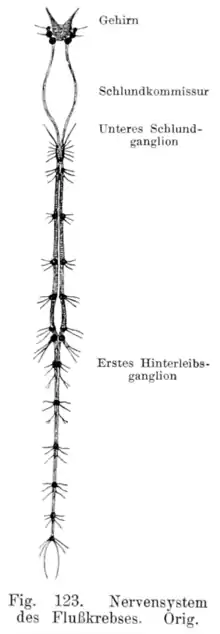Нервная система ракообразных, как и всех членистоногих, представлена парными надглоточными ганглиями, нервным кольцом и брюшной нервной цепочкой. У примитивных жаброногих раков нервная система лестничного типа: парные ганглии в сегментах широко расставлены и соединяются комиссурами. У большинства ракообразных брюшные стволы сблизились, правый и левый ганглии слились, комиссуры исчезли, и только двойственность продольных перемычек между ганглиями соседних сегментов свидетельствует о парном происхождении брюшной нервной цепочки[32]. Как и у большинства членистоногих, у ракообразных проявляется тенденция к олигомеризации (слиянию) ганглиев из разных сегментов, что отличает брюшную нервную цепочку членистоногих от таковой у кольчатых червей[33]. Так, у речного рака, тело которого состоит из 18 сегментов, имеется только 12 нервных узлов[34].