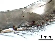 Брюшной отдел состоит из нескольких сегментов и тельсона; как правило, он лишён конечностей. Только у высших раков[15] на брюшке располагаются двувествистые конечности, выполняющие различные функции: у креветок — плавательную, у ротоногих раков — дыхательную, у самцов речного рака две первые пары видоизменены в копулятивные органы, а у самок редуцирована первая пара, остальные же брюшные ножки предназначены для вынашивания молоди. У большинства десятиногих последняя пара брюшных ног имеет пластинчатую форму (уроподы) и вместе с тельсоном образует пятилопастной «плавник»[19].