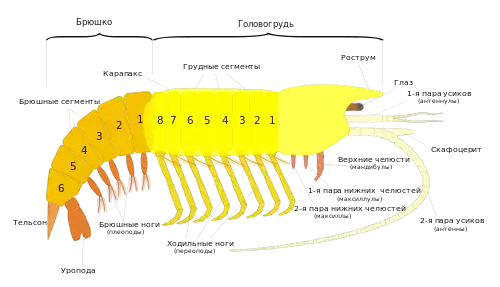 Голова может быть как слитной (синцефалон[15]), так и подразделённой на два сочленённых отдела: протоцефалон, который образуется путём слияния акрона и первого головного сегмента и несёт две первые пары антенн, и гнатоцефалон, образующийся слиянием трёх последних головных сегментов и несущий мандибулы и максиллы. Последний вариант имеет место у отрядов: жаброноги, мизиды, эвфаузиевые, десятиногие, ротоногие[14]. Ротовое отверстие спереди прикрыто непарной складкой кутикулы — верхней губой[16]. Нередко у высших раков (как, например, у речного рака) гнатоцефалон срастается с грудным отделом, формируя челюстегрудь (гнатоторакс), покрытую спинным панцирем — карапаксом. Тело высших раков подразделяется на следующие отделы: голова — протоцефалон (акрон и один сегмент), челюстегрудь — гнатоторакс (три головных и восемь грудных сегментов) и брюшко (6 сегментов и тельсон). В других случаях наблюдается слияние всей головы, не подразделённой на протоцефалон и гнатотоцефалон, с одним или несколькими грудными сегментами. Так образуется головогрудь, за которой следуют грудь и брюшко[18]. У некоторых ракообразных (например, ветвистоусых) голова вытянута в направленный вниз клюв — рострум[15].