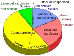 Курение табака на сегодняшний день — основная причина рака лёгкого[4]. По сравнению с некурящими, у курильщиков риск развития рака лёгких выше примерно в 20 раз[5]. Сигаретный дым содержит более 60 известных канцерогенов,[6] в том числе радиоизотопы радона, нитрозамин и бензпирен. Кроме того, полагают, что никотин подавляет иммунную систему, что способствует озлокачествлению тканей[7]. В развитых странах почти 90 % случаев смертельного рака лёгкого вызваны курением[8]. Среди курящих мужчин пожизненный риск развития рака лёгкого составляет 17,2 %, среди курящих женщин — 11,6 %. Этот риск значительно ниже у некурящих: 1,3 % у мужчин и 1,4 % у женщин[9].