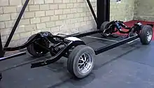 Иногда рассматриваются как разновидность лонжеронных[2]. У такой рамы расстояние между лонжеронами в средней части увеличено настолько, что при установке кузова они оказываются непосредственно за порогами дверей. Так как слабыми местами такой рамы являются места перехода от обычного расстояния между лонжеронами к увеличенному, в этих местах добавляют специальные коробчатые усиления, в англоязычных странах называемые термином torque box (аналогичные силовые элементы — раскосы — нередко имеются и на автомобилях с несущим кузовом в местах перехода от передних и задних лонжеронов к коробам).