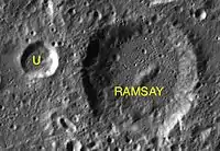 ![]() Снимок зонда Lunar Reconnaissance Orbiter. Кратер Рамзей в центре снимка, вверху сателлитный кратер Жюль Верн P. | |