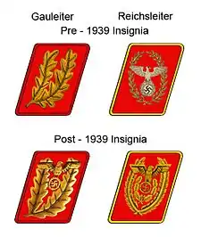 К новым уровням нацистской партии были отнесены несколько новых званий и титулов НСДАП, было проведено реформирование с введением нескольких новых рангов. Некоторые ранги повторялись на каждом уровне партии, а другие являлись уникальными для местных, районных и региональных уровней или национального уровня. Был также создан высший политический ранг — Reichsleiter — высший ранг на национальном уровне, а также самый старший политический ранг в партии после Гитлера.