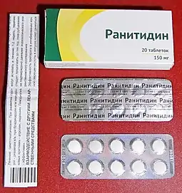 Ранитиди́н (Ranitidin) — противоязвенный лекарственный препарат, относящийся к группе блокаторов H2-гистаминовых рецепторов, препарат второго поколения. Действие ранитидина основано на снижении секреции желудочного сока. Входит в перечень жизненно необходимых и важнейших лекарственных препаратов[1].