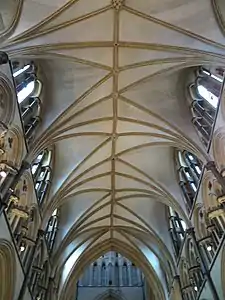 К концу периода ранней готики в Англии, в частности, в Линкольнском соборе, рёберная сеть свода начинает усложняться, хотя первый пример необычного свода — хоры святого Хью в Линкольне (1192—1208) — спроектировал француз Жоффри де Ноэрс. Любопытной особенностью этого так называемого «безумного» свода является смещение нервюр, которые образуют не привычный крестообразный, а Y-образный рисунок[37]. После де Ноэрса в Линкольне работал англичанин Александр Каменщик, спроектировавший звёздчатые своды в нефе собора. Таким образом, к концу ранней готики в Англии помимо нервюр появляются дополнительные арки — лиерны, поддерживающие ребро при вершине свода, и тьерсероны, поддерживающие лиерны, что вместе и образует звёздчатый узор[38][39]. Тенденция к размножению рёбер и сложным переплетениям продолжится в Англии и в эпоху декоративной готики, а наиболее поздний перпендикулярный стиль характеризуется ещё более впечатляющими веерными и «невозможными» воронкообразными сводами с висячими пятами.