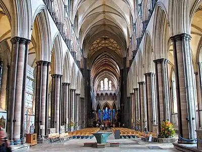 В Солсбери мы встречаемся с образцом зрелого раннеанглийского стиля. В отличие от большинства средневековых английских соборов, Солсберийский строился в течение лишь 40 лет, с 1220 по 1260 год, и только знаменитый шпиль добавлен в следующем веке. Его сложный план с двумя парами трансептов и выдающимся северным портиком, а также прямое завершение хоров — классический план английского собора ранней готики[29], который для понимания страновой специфики достаточно сравнить с французским планом Амьенского собора, начатого в тот же год, и построенного с очень коротким трансептом полукруглой абсидой. Тёмные колонки из пурбекского мрамора создают в трёхъярусном, с высоким трифорием, нефе акцентированно горизонтальную линию. В капелле Девы Марии собора своды опираются на тончайшие колонки, которые уже указывают на зарождение следующего, декоративного стиля[29].