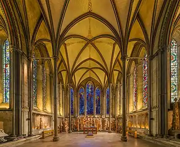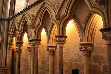 Другим английским элементом Линкольнского собора является глухая аркада в капелле святого Хью, пристроенная к стене в два слоя так, что создаётся впечатление глубокого пространства, которое усиливается от применения камня различных цветов[28].