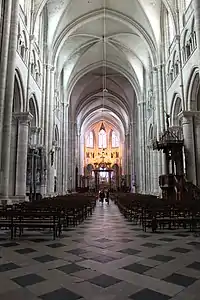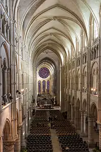Своды нефа — шестичастные на нервюрах, что позволяет перекрыть большой пролёт высоким потолком. Поскольку шестичастный свод создаёт неравномерную нагрузку на опоры, опоры делаются неодинаковыми: массивные квадратные устои чередуются с более лёгкими круглыми колоннами[11][12][13]. Вертикальное строение главного нефа высотой 80 футов (24 метра) трёхъярусное: нижняя аркада, трифорий и верхний ярус с окнами. Первоначально, вероятно, это были небольшие спаренные окна, которые в XIII веке заменены ныне существующими. Вероятно, боковые нефы первоначально не были покрыты сводами, потому что пяты их начинаются не на уровне капителей колонн, а выше на консолях. Капелла при абсиде изначально была одна, остальные добавлены позднее[10].