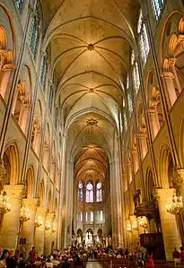 Несмотря на то, что перекрытие главного нефа шестичастное, в отличие от других соборов, в Париже не используется чередование устоя и колонны. Нервюры спускаются с потолка на стены в виде пучков тонких колонок и опираются на широкие классические капители мощных круглых колонн, что гармонизирует интерьер храма. Вертикальное строение нефа изначально было четырёхъярусным, с эмпорами и трифорием, но в XIII веке эмпоры были убраны (в XIX веке в нескольких секциях у трансепта в ходе реставрации их вернул Виолле-ле-Дюк)[19]. Причиной ликвидации эмпор было то, что храм стал казаться тёмным в сравнении с другими, более современными: прямой свет не мог проникнуть не только из боковых окон в главный неф, но даже и попасть в сами окна, которые были затенены контрфорсами. Круглые окна на эмпорах также были слишком глубоко, а окна верхнего яруса — слишком низки. Лучше осветить главный неф удалось, только устранив галерею и сильно понизив крышу над боковыми нефами, чтобы опустить подоконники[20].