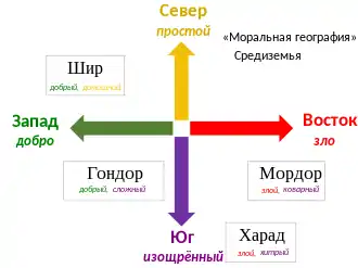 Джон Магун (англ. John Magoun) написал в «Энциклопедии Дж. Р. Р. Толкина» (англ. The J. R. R. Tolkien Encyclopedia), что Средиземье имеет вполне явную «моральную географию». Народы Средиземья варьируются от хоббитов Шира на северо-западе до злых «истерлингов» на востоке и «имперской изощрённости и упадка» на юге. По мнению Магуна, Гондор одновременно «добродетельный» как запад и «имеет проблемы» как юг; Мордор (в переводе с синдарина — «чёрная страна») на юго-востоке — «адское» место, а Харад на дальнем юге регрессирует в «горячее одичание»[12].