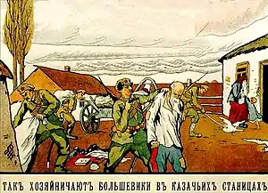 Внедрение советской власти на Дону и Кубани сопровождалось захватом пришлым элементом местного управления, грабежами, реквизициями, арестами, казнями, убийствами (только одних офицеров было убито большевиками на Дону около 500 человек), карательными экспедициями против протестующих станиц и селений[29].