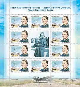 - К 100-летию со дня рождения М. Расковой Саратовский филиал Почты России инициировал выпуск художественного маркированного конверта и односторонней почтовой карточки, на которых изображён памятник Расковой, установленный в Лётном городке города Энгельса[19][20].