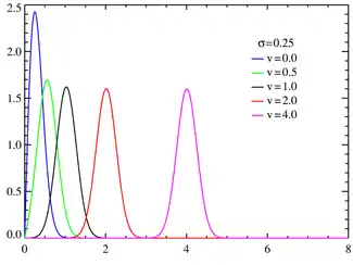 ![]() Плотность распределения Райса для различных значений параметра ν при σ = 1. ![]() Плотность распределения Райса для различных значений параметра ν при σ = 0.25.Плотность вероятности | |
