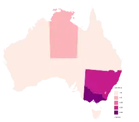 ![]() Подтвержденные случаи COVID-19 в Австралии на миллион жителей по штатам или территориям | |