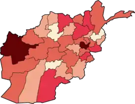 ![]() Карта распространения COVID-19 в Афганистане (по состоянию на 5 мая): Нет подтверждённых случаев 1–9 подтверждённых случаев 10–19 подтверждённых случаев 20-49 подтверждённых случаев 50-99 подтверждённых случаев ≥100 подтверждённых случаев | |
