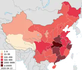 ![]() Подтверждённые случаи заболевания COVID-19 в Китае по провинциям | |