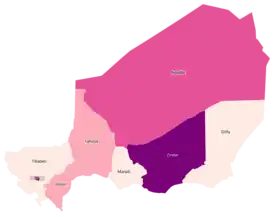 ![]() Подтверждённые случаи COVID-19 в Нигере по регионам, по состоянию на 3 октября 2020 года | |