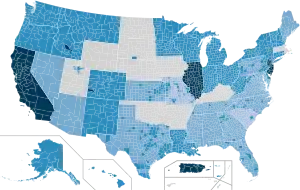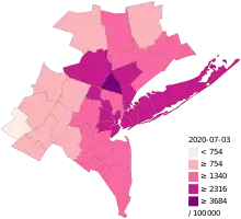 Вспышка COVID-19, которую Всемирная организация здравоохранения (ВОЗ) объявила пандемией 11 марта 2020 года[21], распространялась по США неравномерно. 94 из 154 смертей от COVID-19, зафиксированных в США к 20 марта, произошли в штате Вашингтон[25]. К концу марта эпицентром эпидемии коронавирусной инфекции в США стал Нью-Йорк. К 25 марта 56 % всех подтверждённых случаев заболевания в США приходилось на Нью-Йорк[26]. По данным на 24 марта смертность по подтверждённым случаям заболевания COVID-19 составляла 1,3 %. В большинстве других стран смертность была значительно выше: 4 % в Китае, 9,8 % в Италии, 7,1 % в Испании, 4,9 % во Франции, 5,2 % в Великобритании[27].